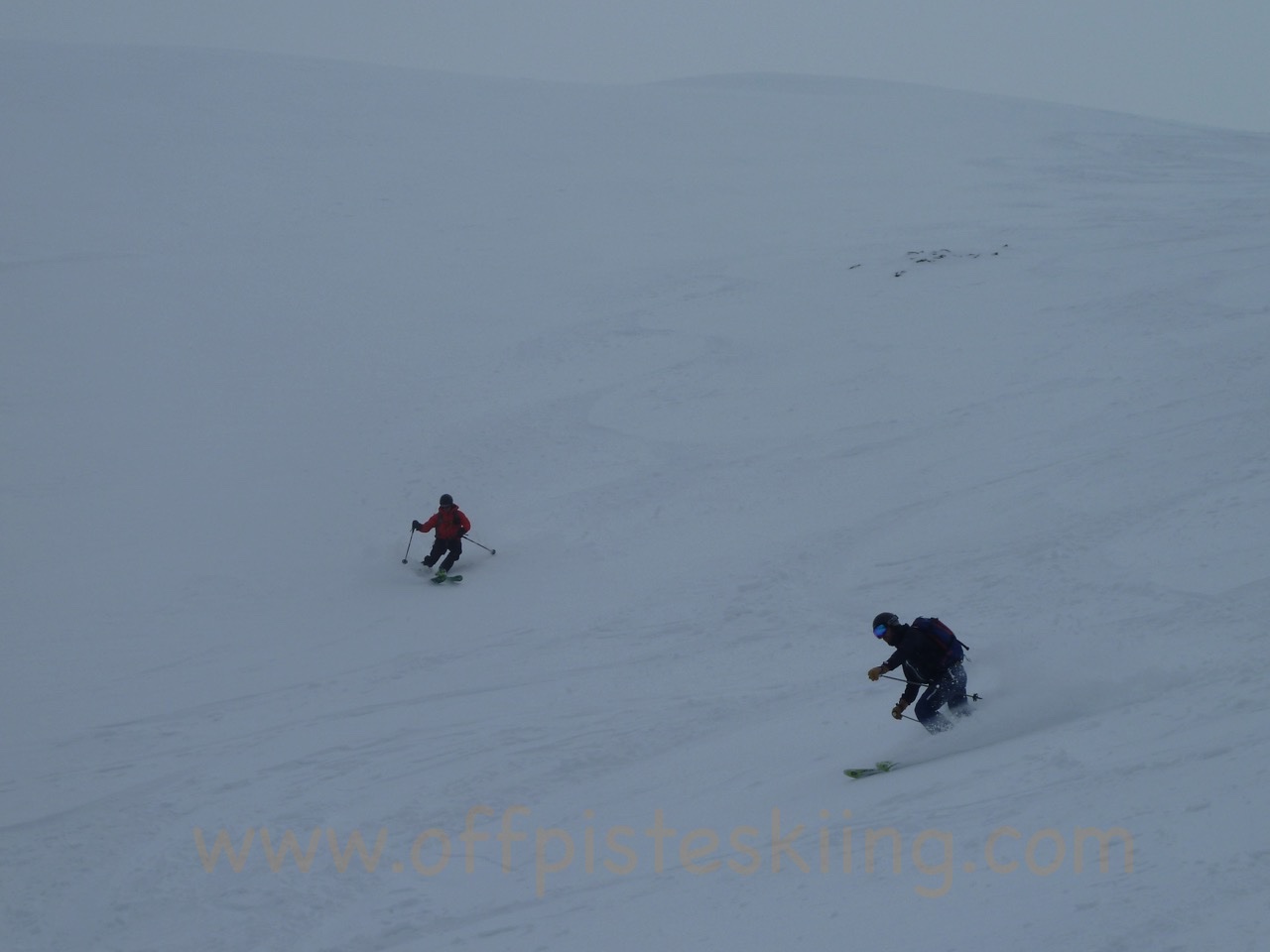 The following day the forecast was calling for clear weather until 2pm, with snow inbound after that. With the damp weather of the previous day we needed a venue that would allow us to gain height quickly so headed to one of my tried and tested ‘sure bets’. The snow had actually firmed up nicely and to top it off the weather held out far longer than expected so we skied 2 great laps in the North bowl and then the North East bowl, with a cheeky mini-gully to finish it off: