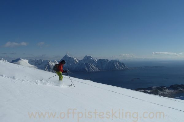 The forecast for the next few days was looking good so on Thursday we decided to go exploring out West – on the drive out to our initial objective another peak which I have looked at for years but never got around to skiing was looking good, so we diverted to that and had a great day with noone else around – no mean feat on one of the busier weeks of the Lofoten touring year: